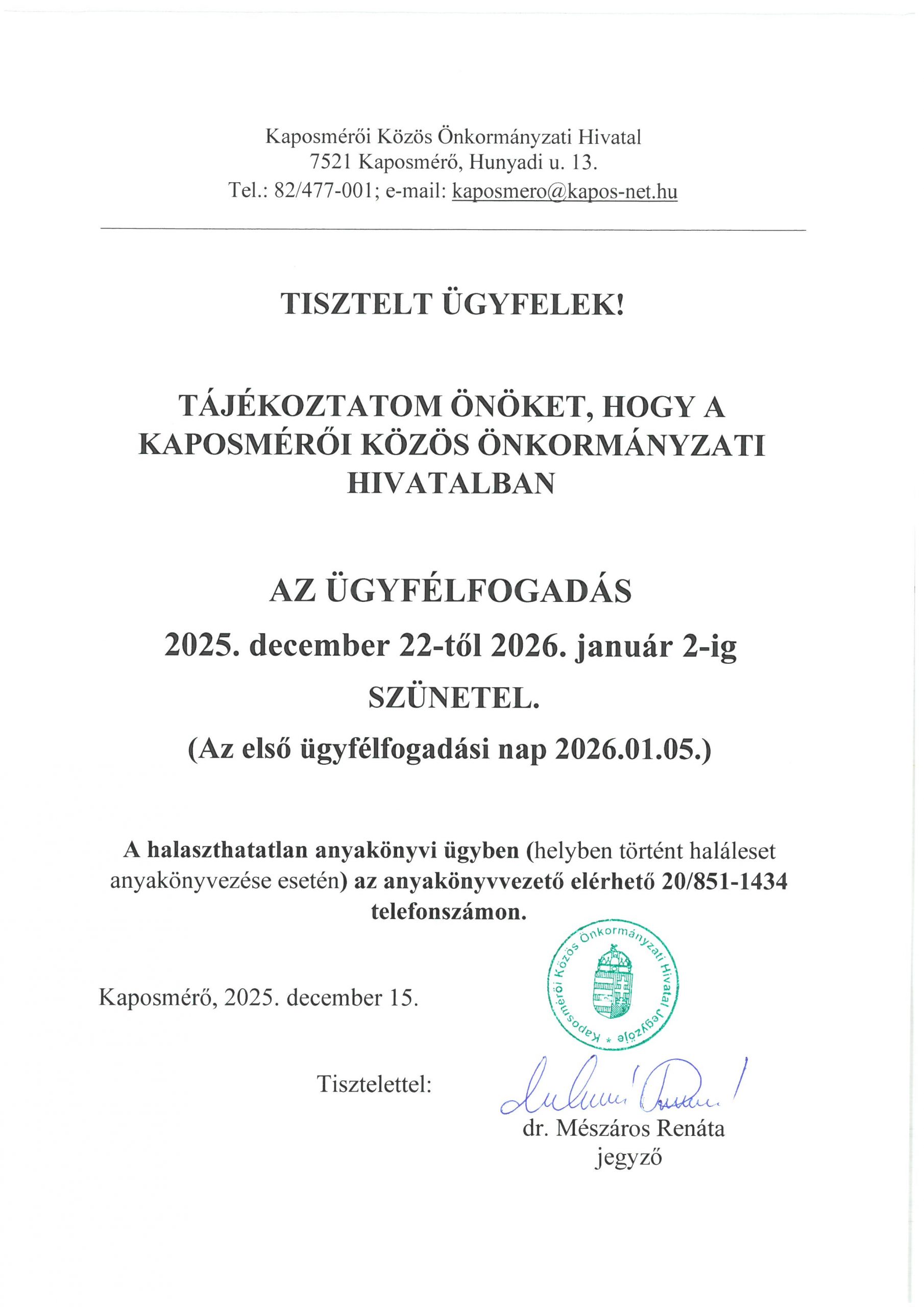 Kezdőlap Hirdetmények Ügyfélfogadás rendje 2025 évvége
